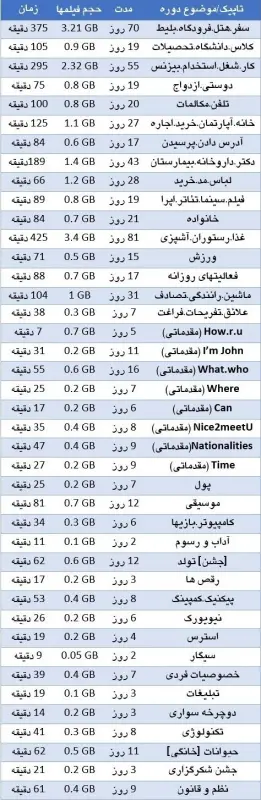 از میان حدود ۴۰ موضوع کاربردی مثل: سفر، رزرو بلیت هواپیما، مراجعه به پزشک، خرید، بیمه، دانشگاه و... یکی را انتخاب می‌کنید، و من برای آن موضوع بین ۵۰ تا ۶۰ فیلم کوتاه آموزشی در اختیار شما می‌گذارم.
