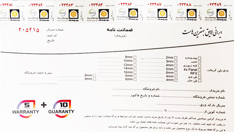 نمونه برگه گارانتی 15 ساله ارائه شده به مشتری ها برای عدم تغییر رنگ و پوسیدگی ورق پلی کربنات
